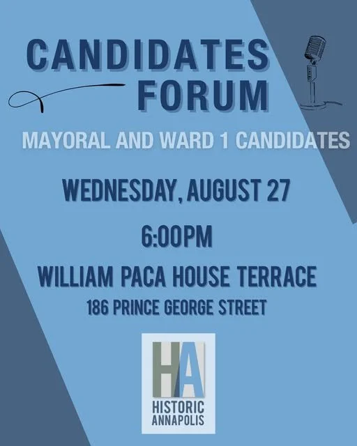 This Wednesday, Historic Annapolis will be hosting a candidate forum focused on preservation and development. Advanced registration is required, and the event is full. Are you planning to attend? Let me know, and I’ll bring you a campaign t-shirt.